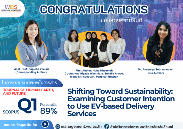 สำนักวิชาการจัดการ มหาวิทยาลัยวลัยลักษณ์ ขอแสดงความยินดีแก่คณาจารย์และนักศึกษา ที่มีผลงานวิชาการได้รับการตอบรับให้ตีพิมพ์ในวารสารระดับนานาชาติ บทความเรื่อง Shifting Toward Sustainability: Examining Customer Intention to Use EV-based Delivery Services ตีพิมพ์ในวารสาร Journal of Human, Earth, and Futu