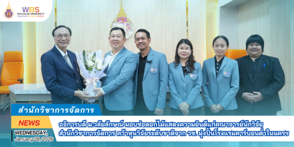 อธิการบดี ม.วลัยลักษณ์ มอบช่อดอกไม้แสดงความยินดีแก่คณาจารย์นักวิจัย สำนักวิชาการจัดการ คว้าทุนวิจัยระดับชาติจาก วช. มุ่งปั้นโรงแรมคาร์บอนต่ำในนครศรีธรรมราช วันที่ 28 มกราคม 2569 – ณ ห้องประชุมโมคลาน ชั้น 3 อาคารศาสตราจารย์ ดร.วิจิตร ศรีสอ้าน มหาวิทยาลัยวลัยลักษณ์ ศาสตราจารย์ ดร.สมบัติ ธำรงธัญวงศ์ อธ