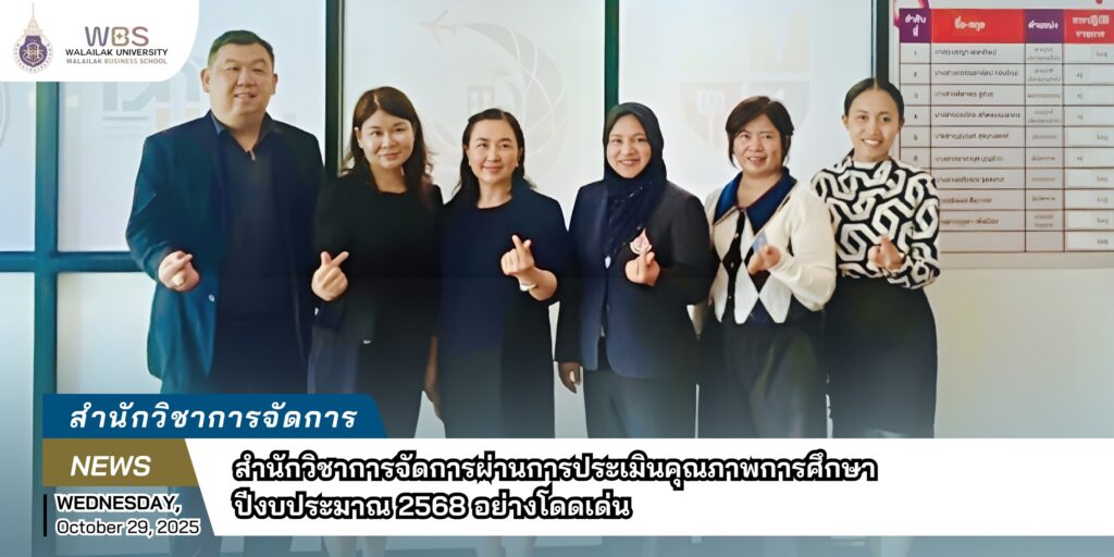 เมื่อวันที่ 29 ตุลาคม 2568 เวลา 09.00 – 12.00 น. ณ ห้องประชุม 113 อาคารวิชาการ 3 ทางสำนักวิชาการจัดการ มหาวิทยาลัยวลัยลักษณ์ ได้ดำเนินการจัดการประเมิน การประกันคุณภาพการศึกษาภายใน ระดับสำนักวิชา ประจำปีงบประมาณ พ.ศ. 2568 เสร็จสิ้นลงด้วยผลลัพธ์ที่โดดเด่นและน่าภาคภูมิใจ โดยผลการประเมินคุณภาพการศึกษาระดับหลักสูตรทั้งหมดเป็นไปตามเกณฑ์มาตรฐาน WUQA-S ซึ่งเป็นเกณฑ์การประกันคุณภาพของมหาวิทยาลัยวลัยลักษณ์