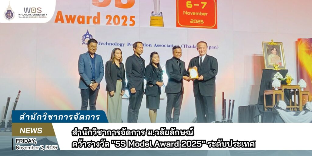 เมื่อวันที่ 7 พฤศจิกายน 2568 สำนักวิชาการจัดการ มหาวิทยาลัยวลัยลักษณ์ สร้างชื่อเสียงอีกครั้ง โดยได้รับรางวัลอันทรงเกียรติ “5S Model Award 2025” จาก สมาคมส่งเสริมเทคโนโลยี (ไทย-ญี่ปุ่น) หรือ ส.ส.ท. (Technology Promotion Association (Thai-Japan) – TPA) ณ ห้องแกรนด์ฮอลล์ ศูนย์นิทรรศการและการประชุมไบเทค บางนา กรุงเทพฯ