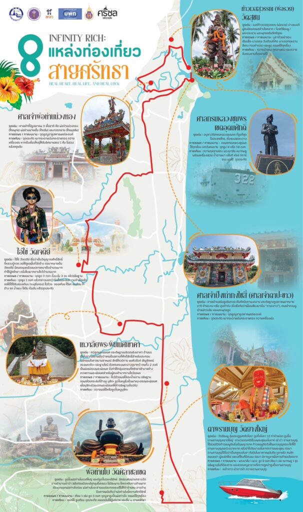 The Infinity Rich route consists of eight attractions. It begins at Wat Yang Yai, where visitors pay homage and request blessings for good fortune from Ta Phran Boon, and then proceeds to Wat Silachonkhet, where they venerate the revered giant monk statue, Phor Than Bo Ong Yai. The journey continues to the shrine of Lord Ganesha at Khao Ka, where it is believed that a whispered wish will be granted.