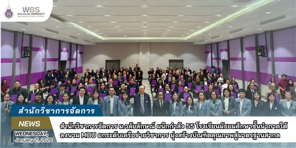 January 21, 2026 – The School of Management at Walailak University hosted a significant Memorandum of Understanding (MOU) signing ceremony with 55 premier high schools from across Southern Thailand. The event, held at the Pattarathammaporn Meeting Room, Walailak University Hospital, welcomed over 100 school administrators and representatives.