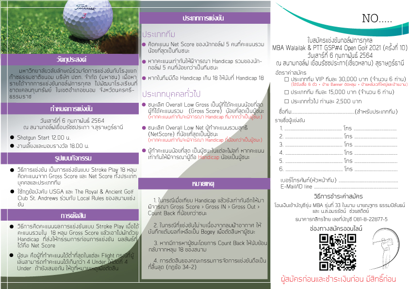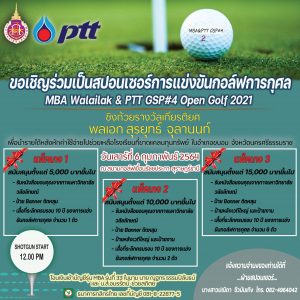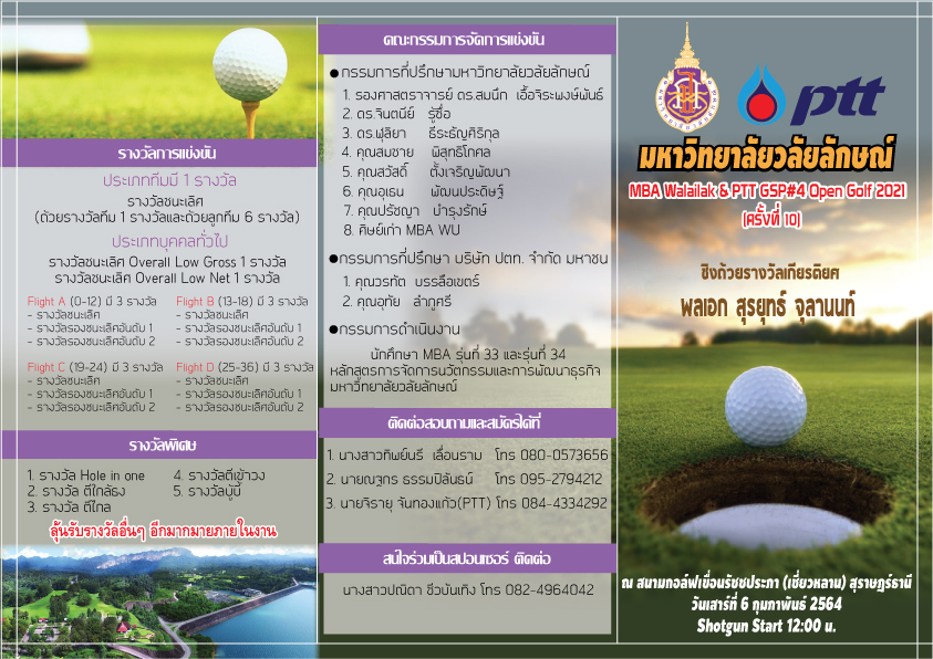 โครงการหลักสูตรบัณฑิตศึกษาทางการจัดการนวัตกรรมและการพัฒนาธุรกิจ สำนักวิชาการจัดการ มหาวิทยาลัยวลัยลักษณ์ ร่วมกับโรงแยกก๊าซธรรมชาติขนอม ปตท. จำกัด (มหาชน) ขอเชิญร่วมการแข่งขันกอล์ฟการกุศล “MBA Walailak & PTT GSP#4 Open Golf 2021” (ครั้งที่ 10) ชิงถ้วยรางวัลเกียรติยศ พลเอก สุรยุทธ์ จุลานนท์ วันเสาร์ที่ 6 ก.พ. 64 ณ สนามกอล์ฟ เขื่อนรัชชประภา เพื่อนำรายได้หลังหักค่าใช้จ่ายไปช่วยเหลือโรงเรียนที่ขาดแคลนทุนทรัพย์ ในอำเภอขนอม จังหวัดนครศรีธรรมราช