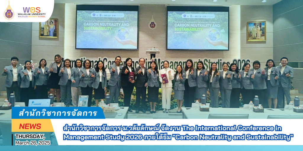 เมื่อวันที่ 26 มีนาคม 2569 สำนักวิชาการจัดการ มหาวิทยาลัยวลัยลักษณ์ ได้จัดงานประชุมวิชาการระดับนานาชาติ International Conference in Management Study 2026 (ICMS 2026) ณ ห้องประชุมภัทรธรรมพร โรงพยาบาลศูนย์การแพทย์มหาวิทยาลัยวลัยลักษณ์ ภายใต้หัวข้อ “Carbon Neutrality and Sustainability”