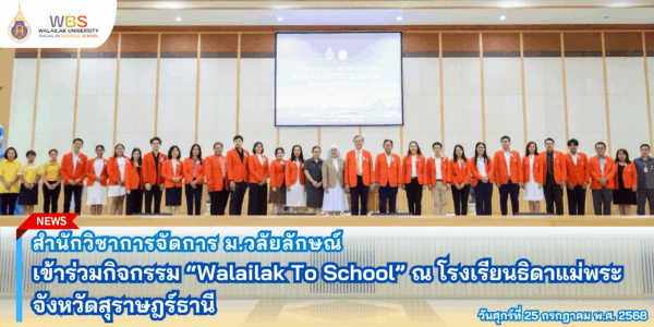 สำนักวิชาการจัดการ ม.วลัยลักษณ์ เข้าร่วมกิจกรรม “Walailak To School” ณ โรงเรียนธิดาแม่พระ จ.สุราษฎร์ธานี เมื่อวันที่ 25 กรกฎาคม 2568 สำนักวิชาการจัดการ มหาวิทยาลัยวลัยลักษณ์ เข้าร่วมกิจกรรม “Walailak To School” ซึ่งจัดขึ้น ณ โรงเรียนธิดาแม่พระ จังหวัดสุราษฎร์ธานี โดยได้รับเกียรติจาก ศาสตราจารย์ ดร.ส