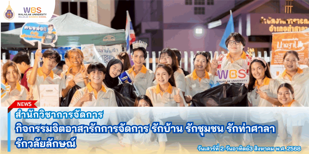 เมื่อวันที่ 2–3 สิงหาคม 2568 สำนักวิชาการจัดการ มหาวิทยาลัยวลัยลักษณ์ จัดกิจกรรมจิตอาสา “รักบ้าน รักชุมชน รักท่าศาลา รักวลัยลักษณ์” โดยมีนักศึกษาร่วมแรงร่วมใจกันทำกิจกรรมเพื่อสาธารณประโยชน์ในพื้นที่ชุมชน ณ งานเรี่ยม อำเภอท่าศาลา จังหวัดนครศรีธรรมราช อาทิ เก็บขยะ ปรับภูมิทัศน์ และสร้างจิตสำนึกเรื่องความสะอาดและสิ่งแวดล้อม