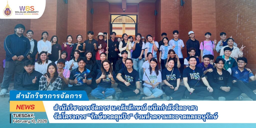 วันที่ 10 กุมภาพันธ์ 2569 สำนักวิชาการจัดการ มหาวิทยาลัยวลัยลักษณ์ (WBS) จัดกิจกรรมบำเพ็ญประโยชน์ภายใต้โครงการจิตอาสา “รักษ์ทวดตุมปัง” เพื่อเชิญชวนคณาจารย์ บุคลากร และนักศึกษา ร่วมมือร่วมใจกันทำความสะอาดและอนุรักษ์โบราณสถานตุมปัง ซึ่งเป็นพื้นที่ประวัติศาสตร์และศูนย์รวมจิตใจสำคัญภายในรั้วมหาวิทยาลัย