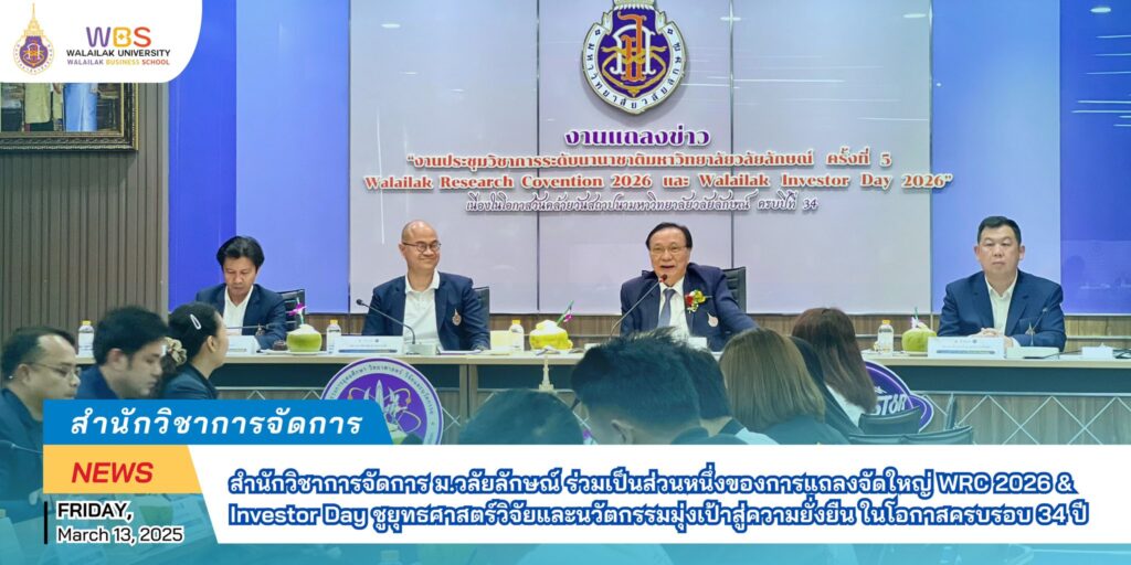 สำนักวิชาการจัดการ มหาวิทยาลัยวลัยลักษณ์ ได้ร่วมเป็นส่วนหนึ่งของการแถลงจัดใหญ่ WRC 2026 & Investor Day ชูยุทธศาสตร์วิจัยและนวัตกรรมมุ่งเป้าสู่ความยั่งยืน ในโอกาสครบรอบ 34 ปี
